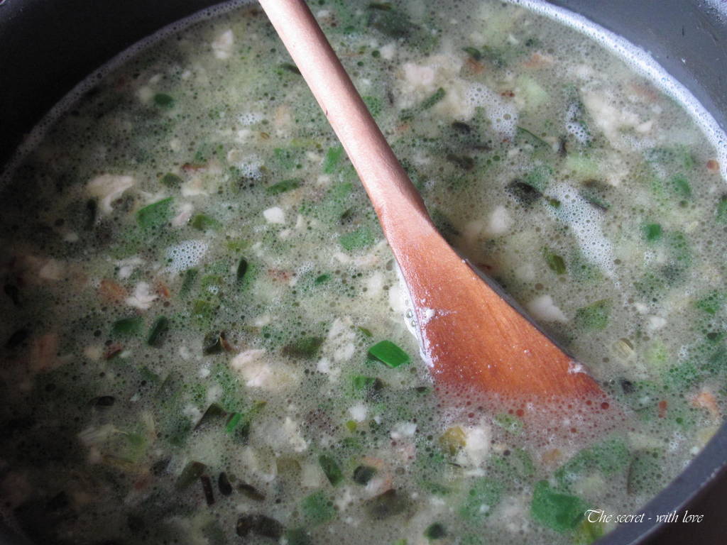 5. Добавете листните зеленчуци, нарязани на ситно, магданоза и джоджена. Подправете със сол, черен пипер и лют пипер на вкус. Оставете супата да поври, докато оризът омекне.